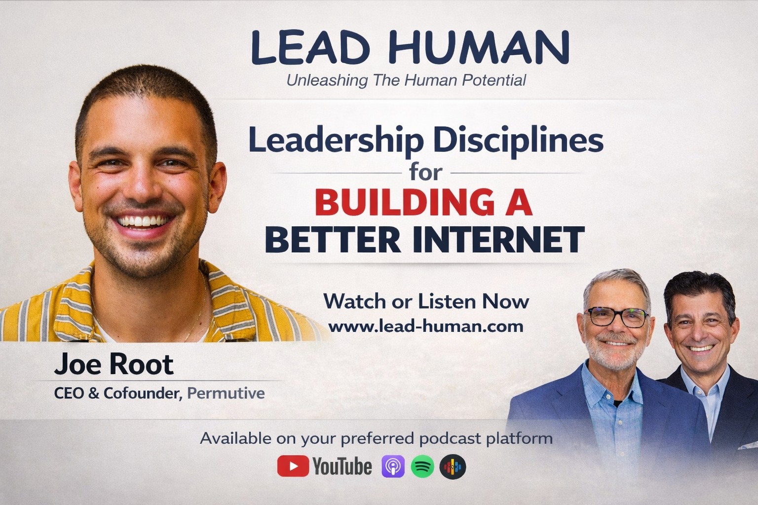 What follows in this conversation is not a product pitch. It is a blueprint for how leaders can rethink the relationship between technology, trust, and human value. To hear Joe Root discuss these ideas in depth, watch or listen to the full episode of Lead Human with Jack Myers and Tim Spengler. All platforms are available at www.lead-human.com, including YouTube, Spotify, and Apple Podcasts. Scroll down to continue reading.